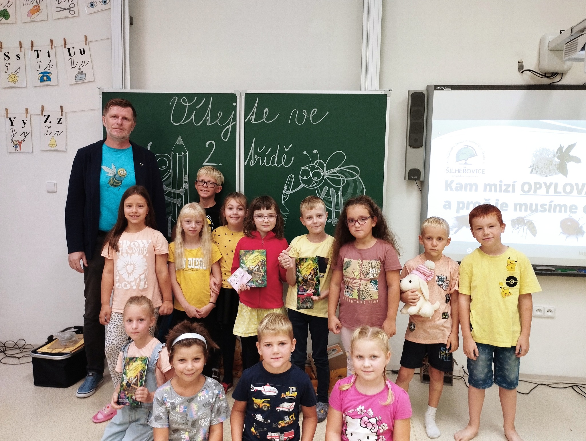 „Kam mizí opylovatelé a proč je musíme chránit“. Přednáška byla velice poutavá a žáci se dozvěděli mnoho zajímavých informací. Např., kolik má včela očí a kde má své srdce. A co vy, víte to? Naši žáci už ano. Rostislav Poláček je zároveň spisovatelem oblíbených dětských knih, jejichž tématem je právě příroda, hmyz a jejich ochrana, hmyzí domečky, … a píše je s cílem zvyšovat povědomí čtenářů o těchto užitečných pomocnících. Tyto knihy si žáci následně mohli zakoupit. Dětem i samotným paním učitelkám se program moc líbil a ocenili i zajímavé knihy.